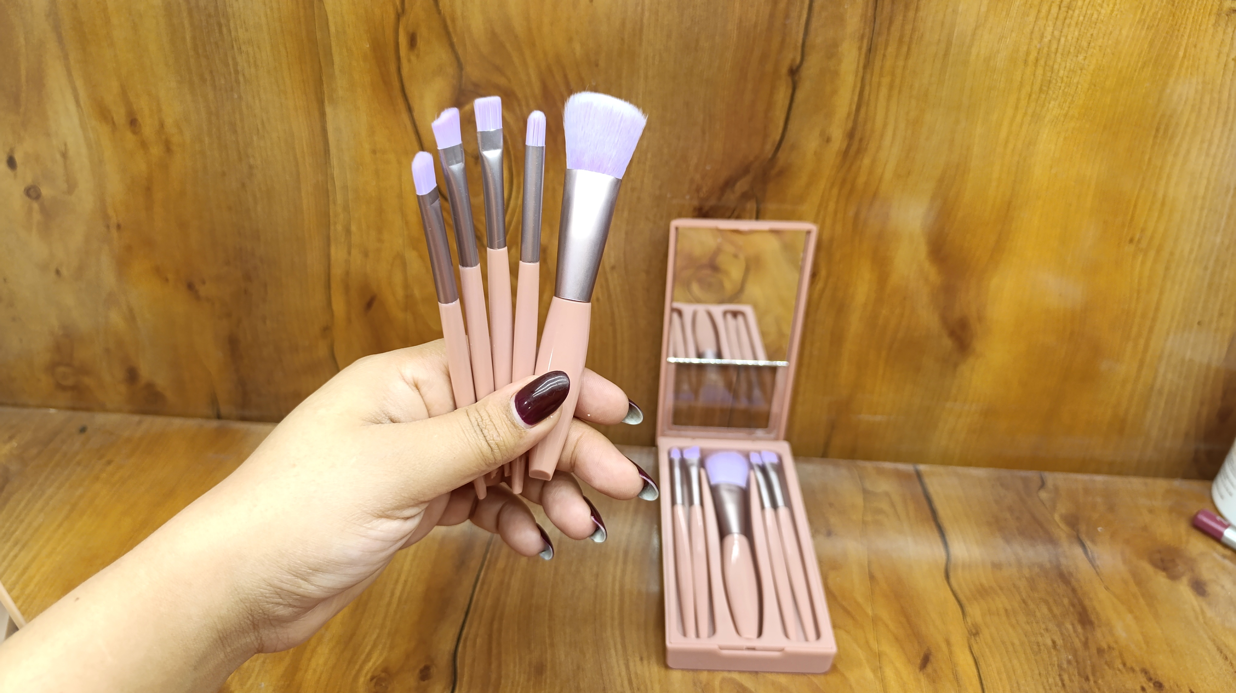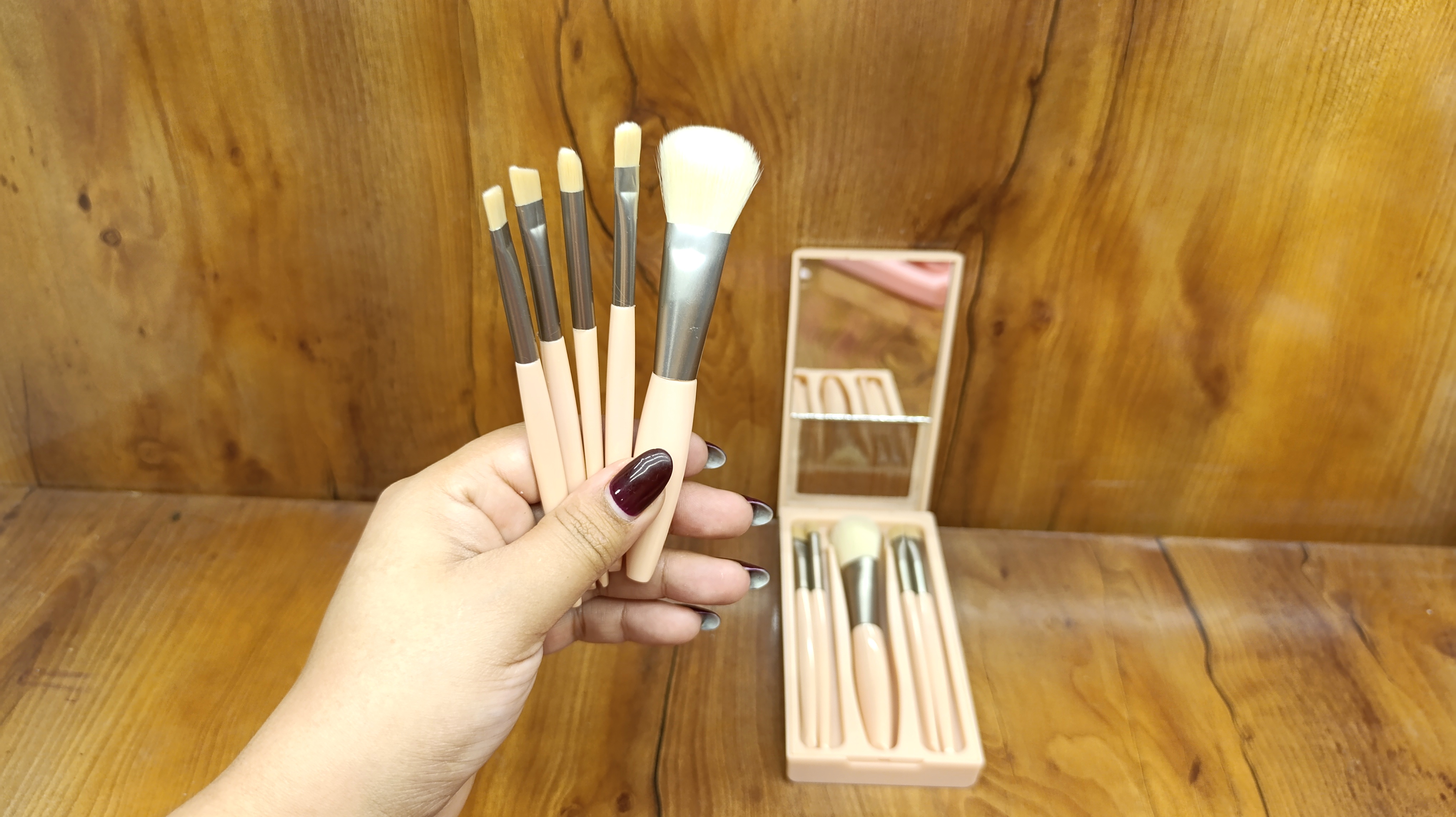 ست براش ۵ تیکه، همراه با جعبه و آینه.تراکم خیلی خوبی دارن و ریزش هم ندارن. ۵ تا براش اصلی که برا یه میکاپ خوب احتیاجه رو داره.